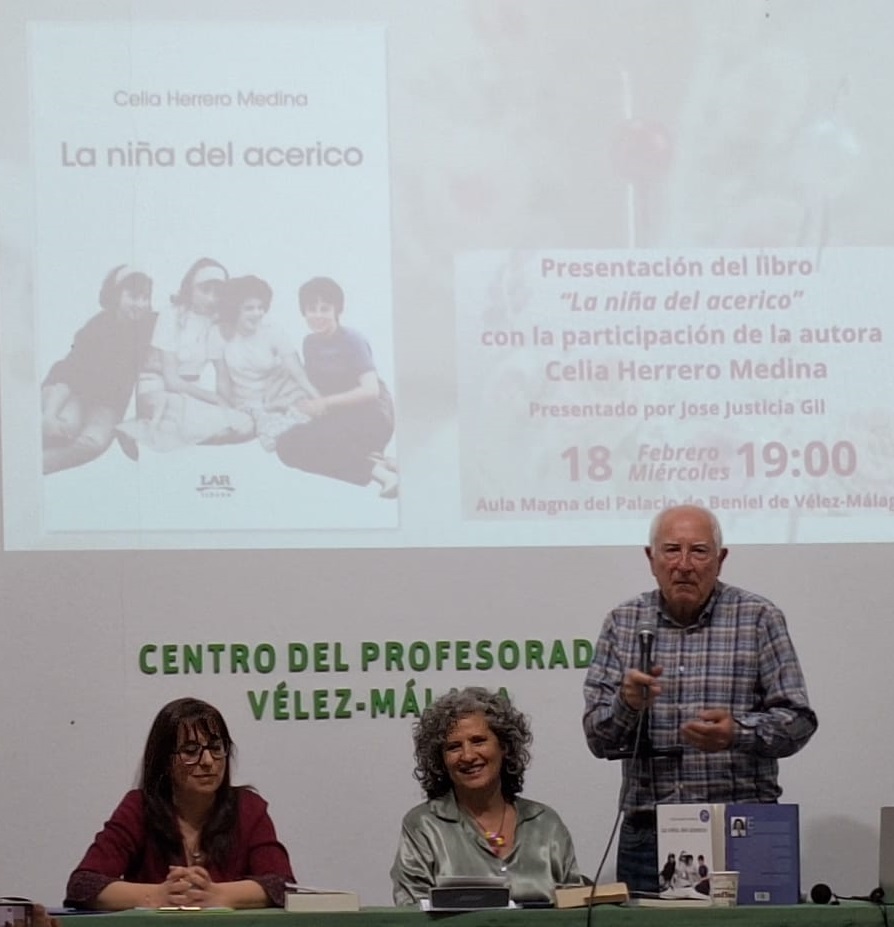 La presentación de la autora la llevó a cabo Jose Justicia Gil, a la que tenemos que agradecer la presencia de la autora Celia Herrero hoy aquí, y también le agradecemos la magnífica presentación que con su ingenio, simpatía y emotividad nos ha preparado un dibujo de la obra no solo desde el punto de vista de la literatura, también como crónica de un periodo en la vida de los españoles y del que ahora sólo hago un pequeño esbozo.