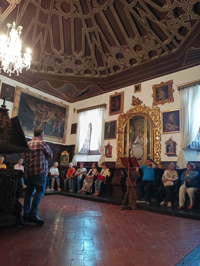 Un nutrido grupo de socios y amigos de la SAC pudimos conocer de primera mano el magnífico patrimonio material del Monasterio de Santa Clara. Acompañados por Juan Casado, experto conocedor de este impresionante edificio, la visita recorre varias dependencias de la antesacristía, la propia sacristía, sala de los frailes, la celda y oratorio de la Condesa de Feria, Claustro alto, sala Capitular y coro alto y la imponente iglesia donde destaca la impresionante armadura mudéjar que la cubre. Todo ello acompañado de importantes obras de arte desde lienzos, orfebrería y esculturas de los principales maestros del Barroco español.